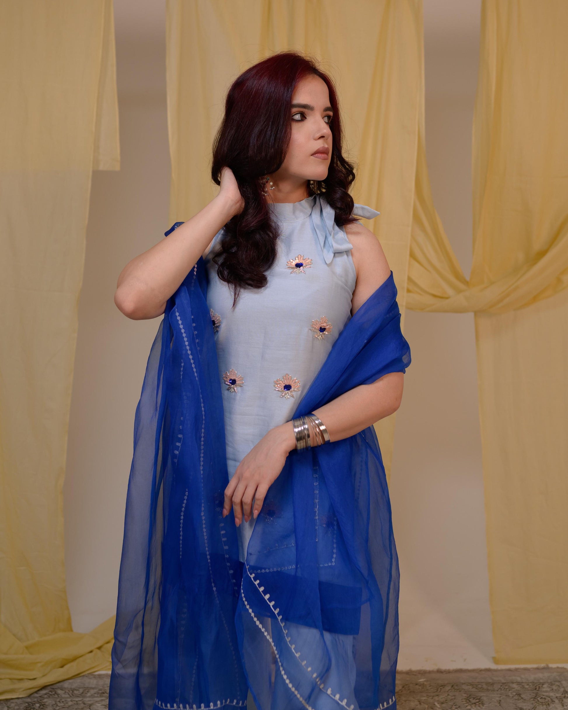 Powder Blue Palazzo Suit Set with Royal Blue Dupatta | Tarah by Tripti